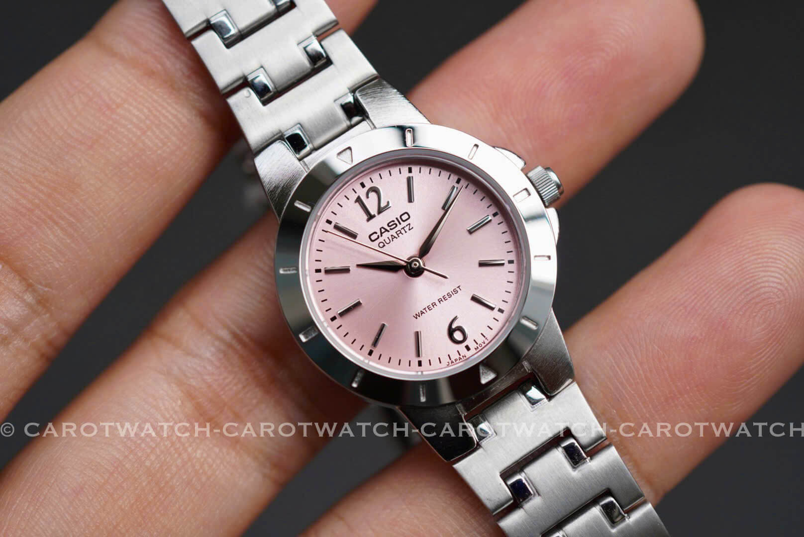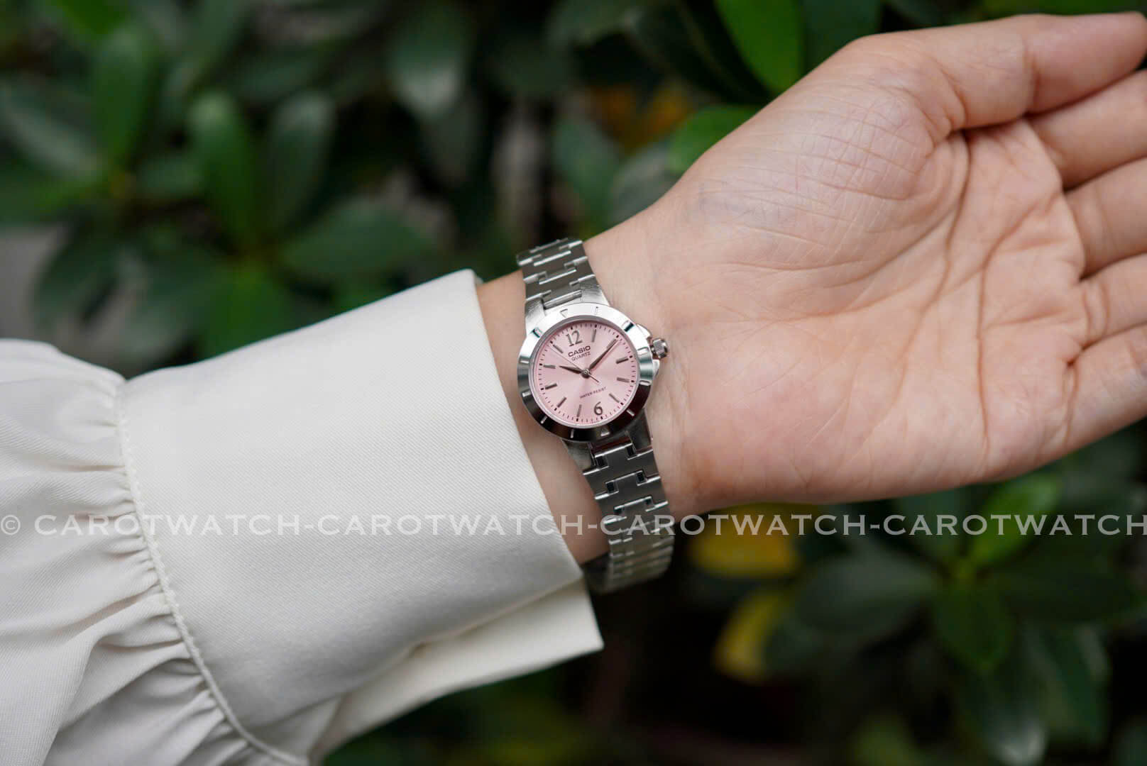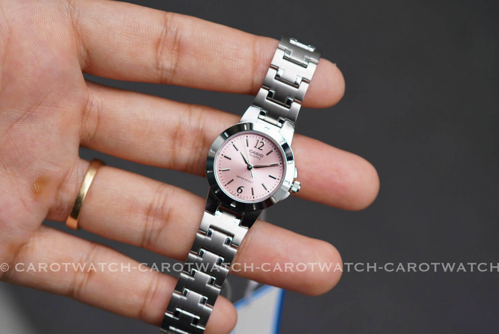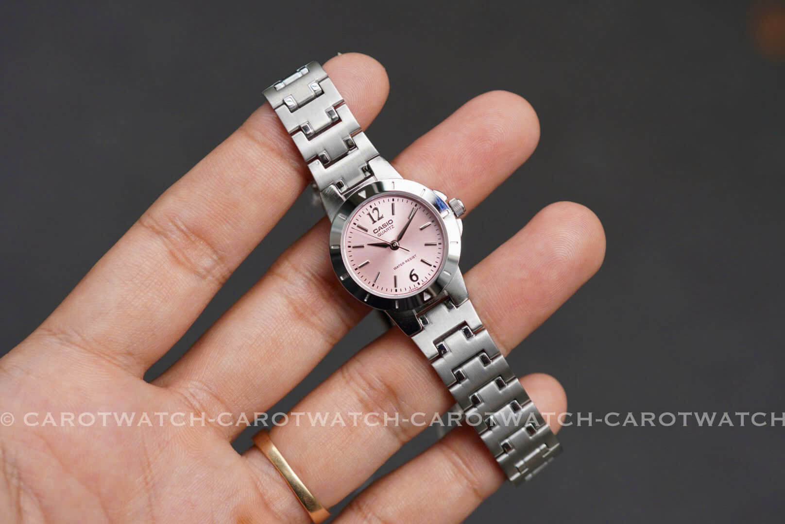 CASIO LTP-1177A-4A1 với gam màu hồng trẻ trung, nữ tính. Size mặt nhỏ gọn, phù hợp với các bạn nữ tay nhỏ hoặc đang tìm một chiếc đồng hồ nhỏ gọn để mang đi học, đi làm, đi chơi