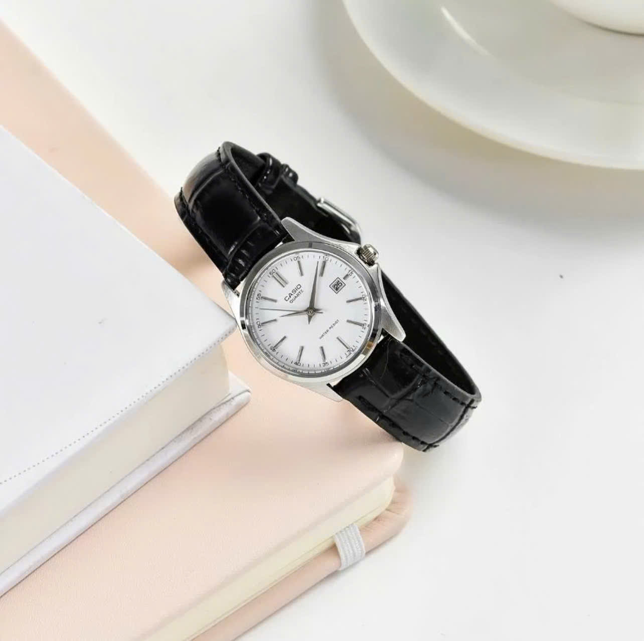 Mặt trắng nhẹ nhàng đi cùng dây da đen, cực kỳ thoải mái khi đeo cả ngày dài. Kích thước nhỏ gọn 28.5mm, phù hợp với nữ cổ tay nhỏ. Có lịch ngày, chống nước sinh hoạt.