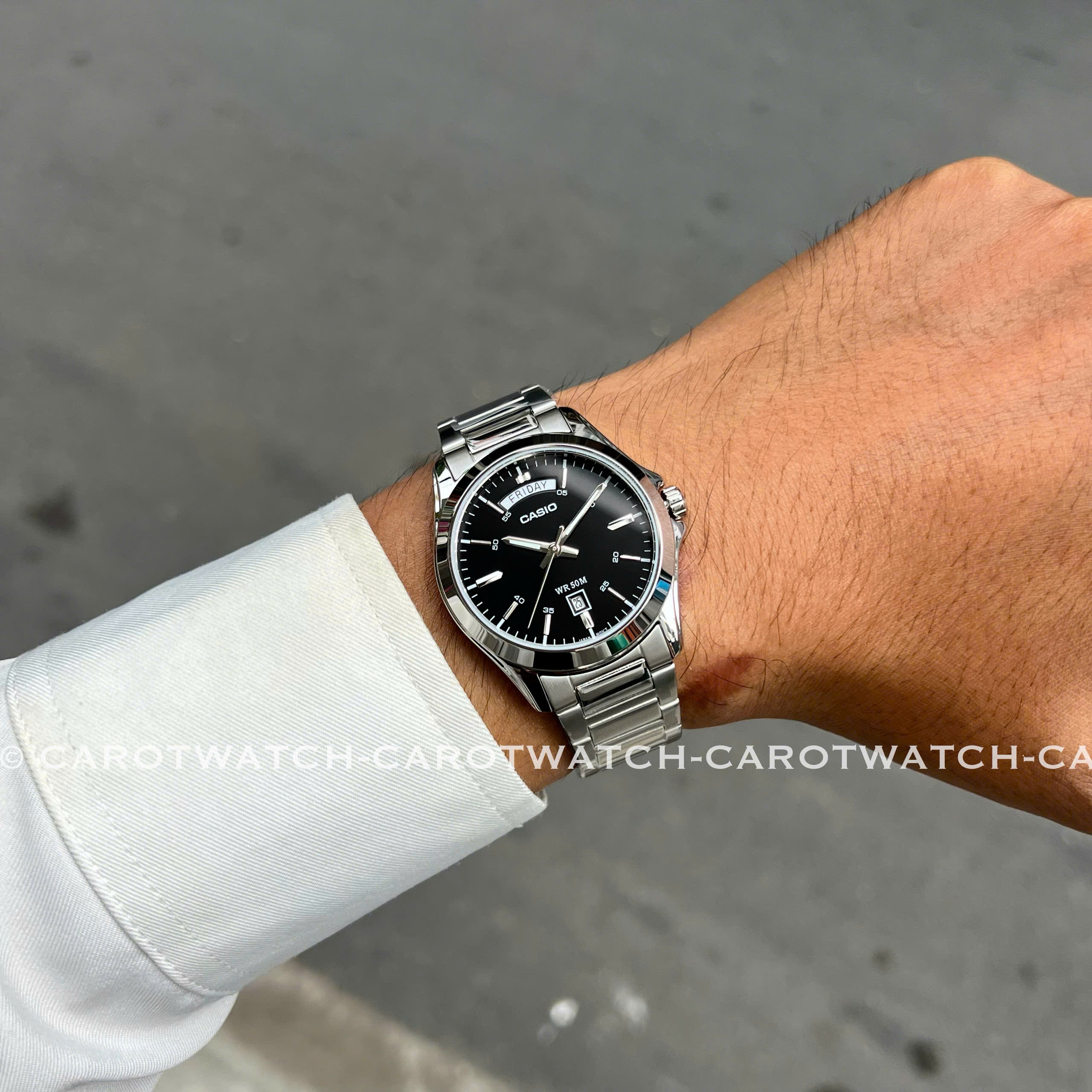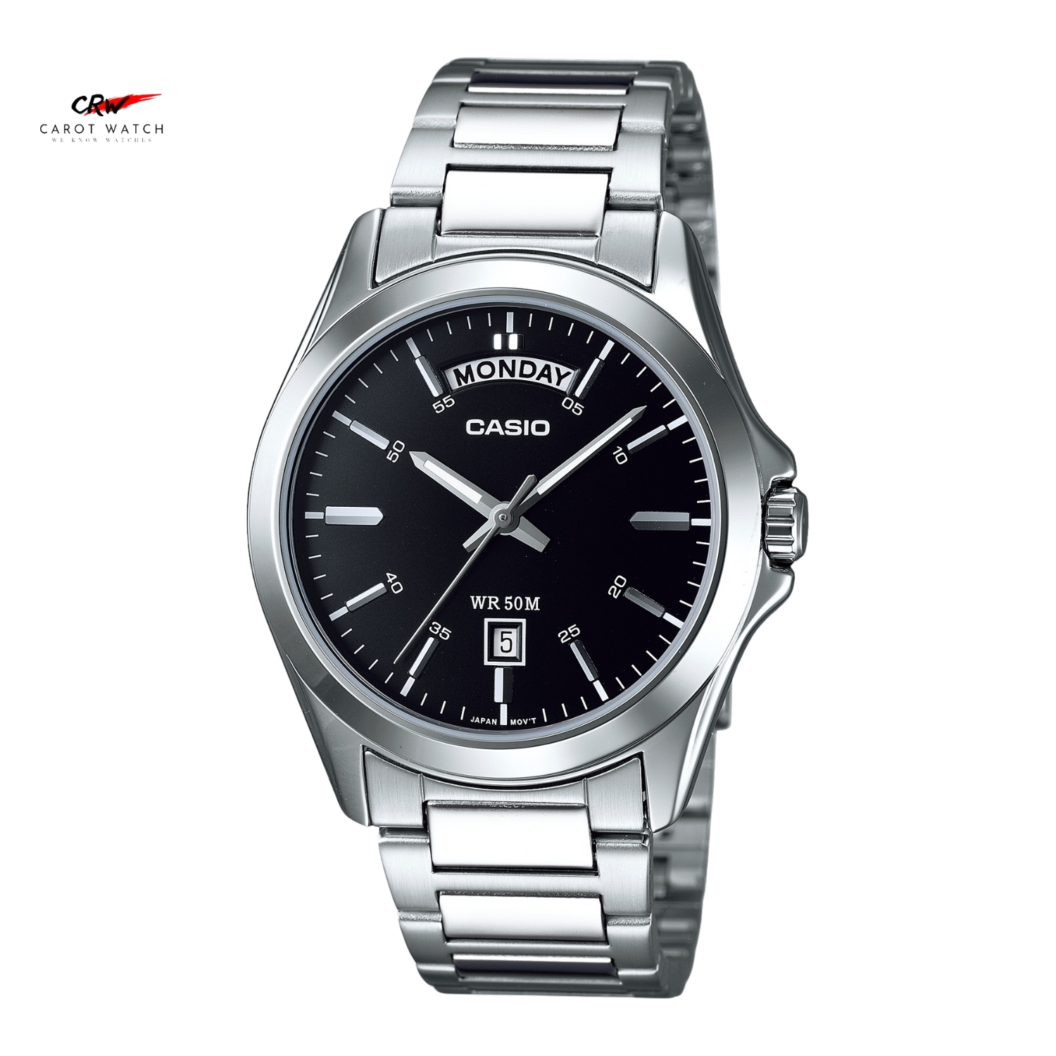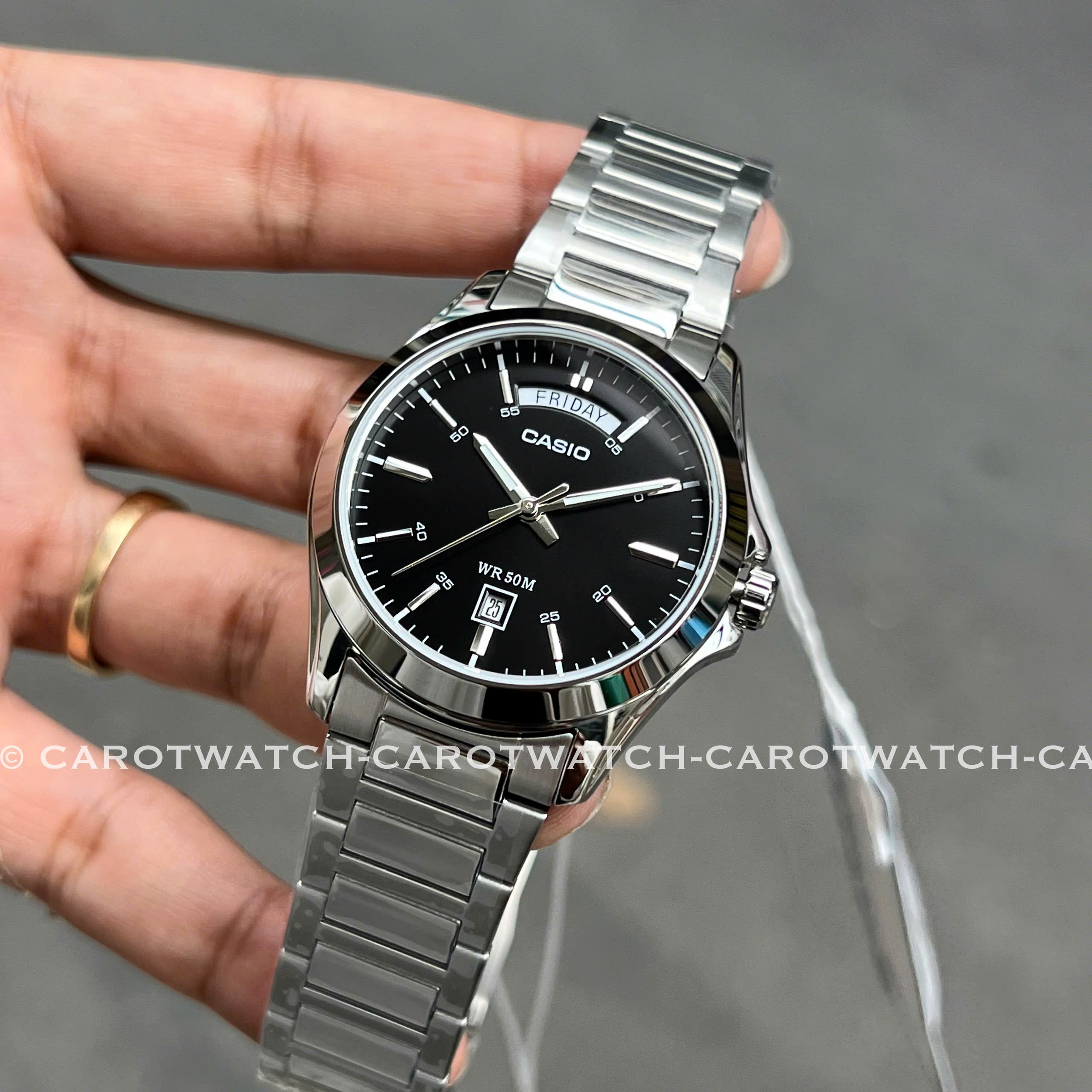 MTP-1370D-1A1 đen nam tính, mạnh mẽ. Size mặt 39.8mm phù hợp với các bạn có cổ tay vừa và nhỏ. Thiết kế lịch thứ – ngày (day date) tiện lợi, dây thép không gỉ bền bỉ – phù hợp phong cách công sở chỉn chu. Ngoài ra, đồng hồ còn có chống nước 5ATM đủ dùng trong sinh hoạt hàng ngày như đi mưa, rửa tay.