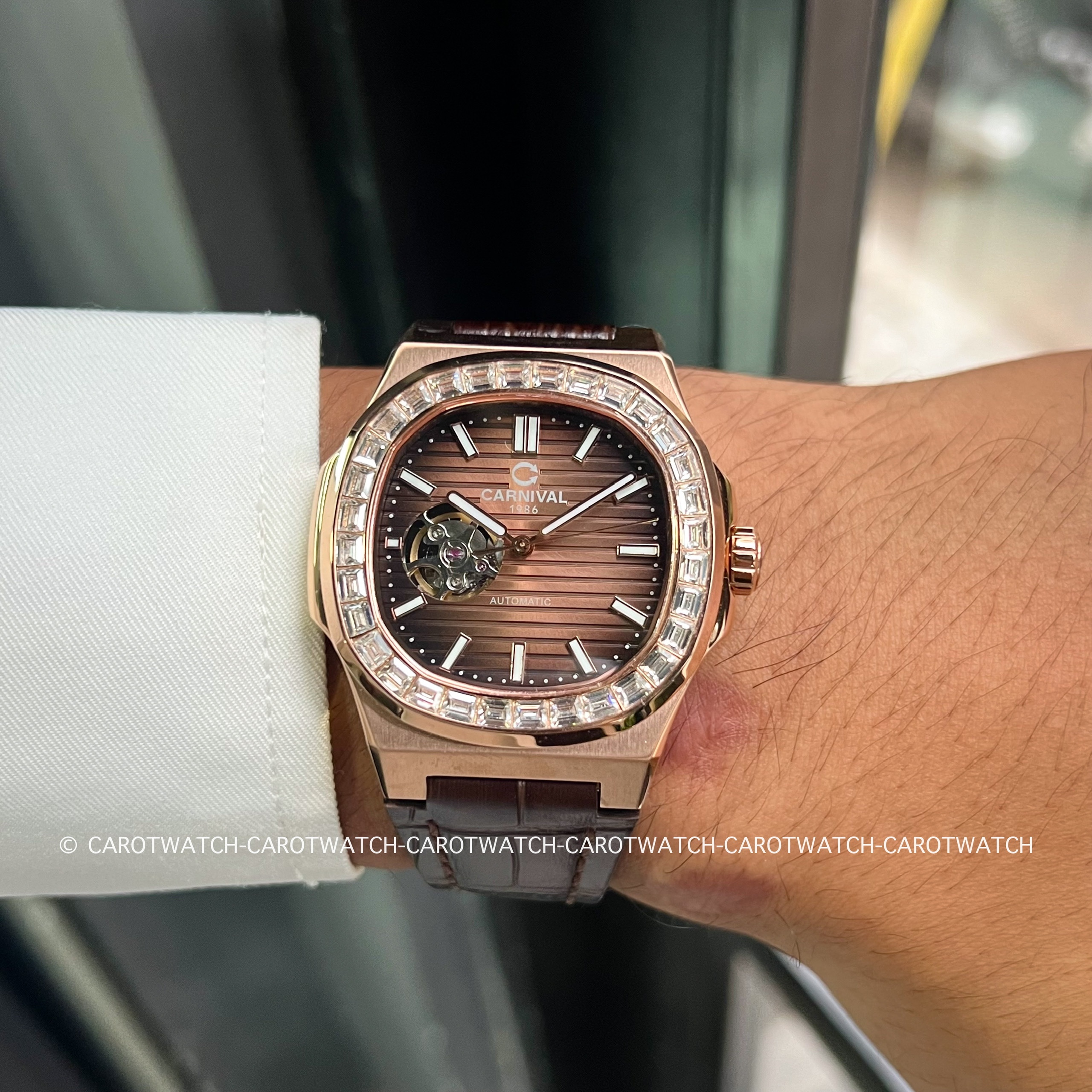 Mặt nâu chocolate lộ cơ 9h đầy cuốn hút, viền đính đá mạ vàng hồng PVD sang trọng. Phối dây da nâu mềm mại, size mặt 40mm vừa tay. Đồng hồ sử dụng máy automatic, kính sapphire cao cấp – thiết kế dành cho quý ông yêu sự chỉn chu và khí chất trầm ổn.