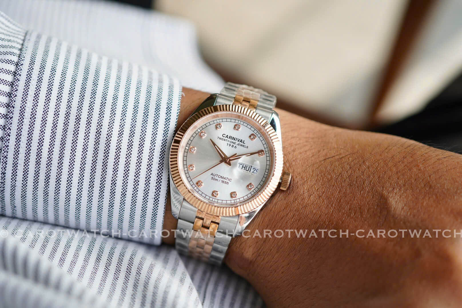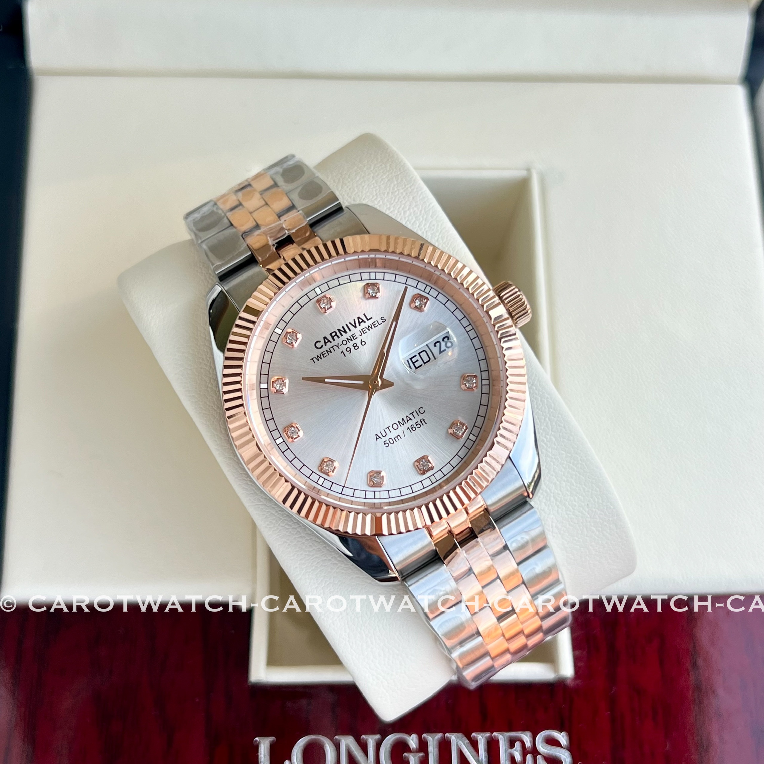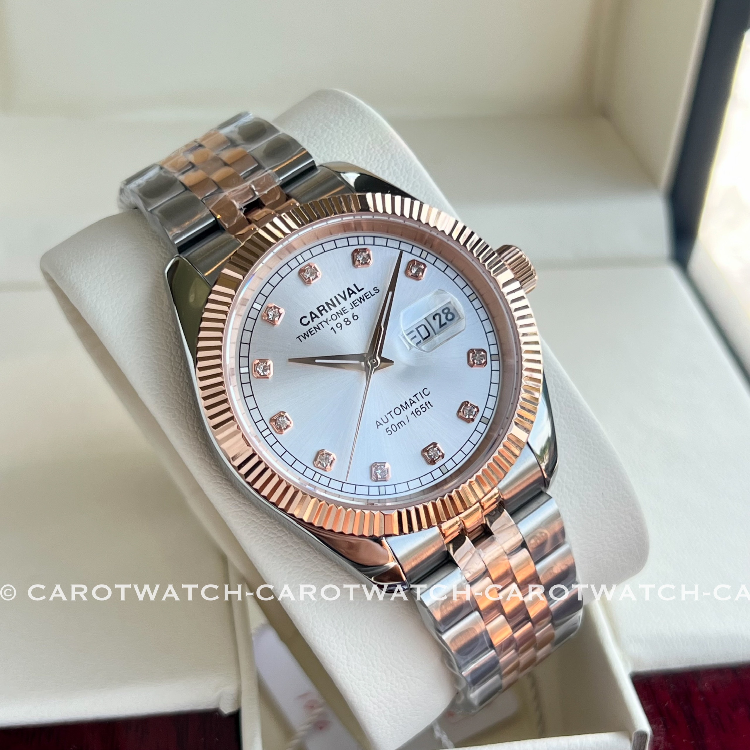 Thiết kế demi vàng hồng pha bạc nhẹ nhàng mà không kém phần sang trọng. Mặt số trắng nhã nhặn cân bằng giữa sự thanh lịch và đẳng cấp.