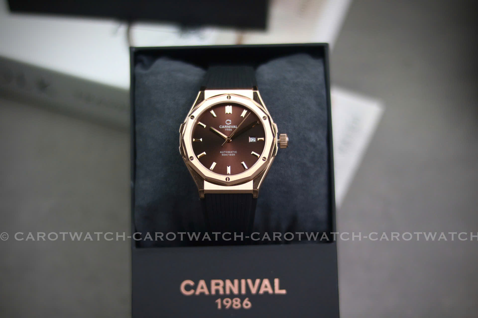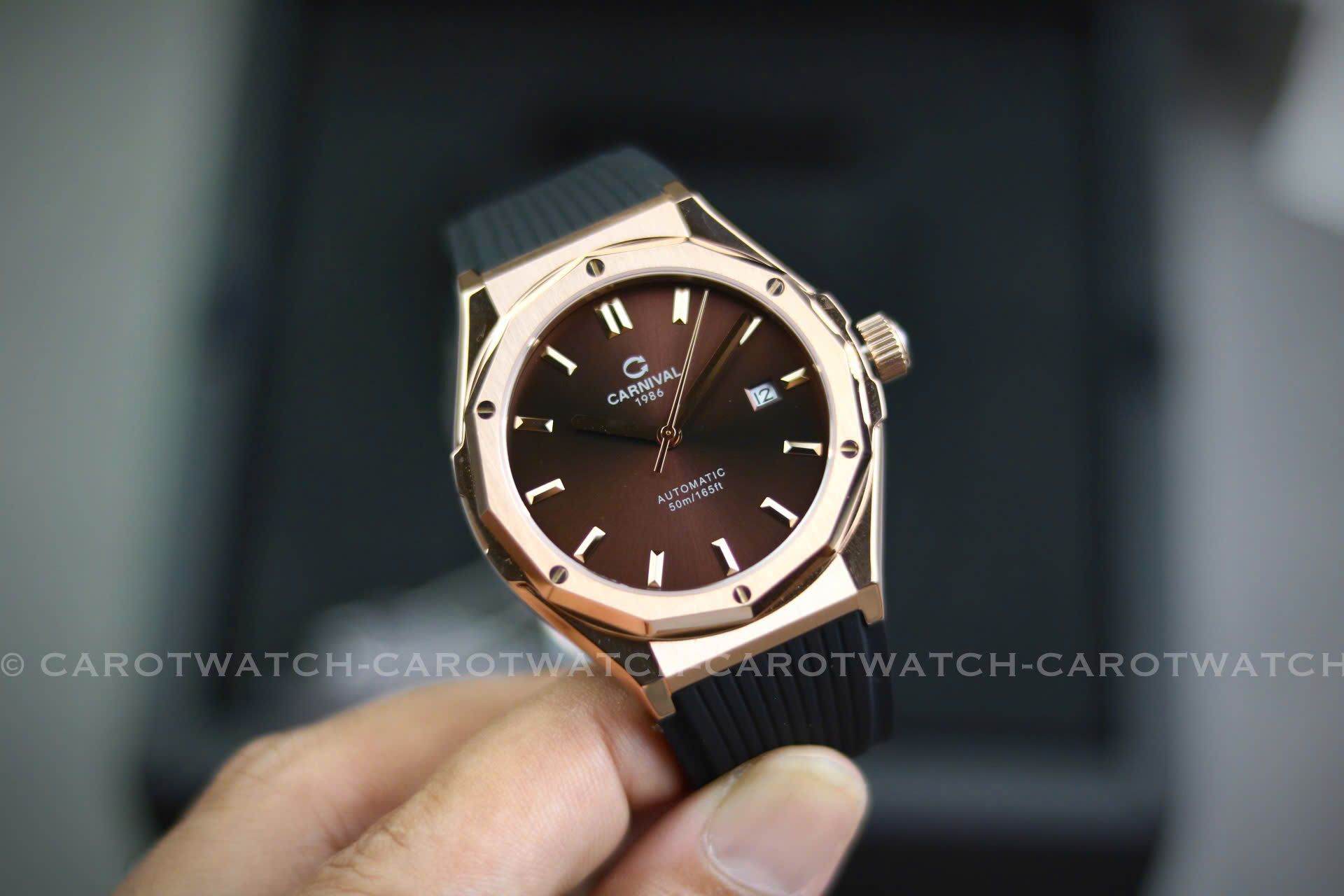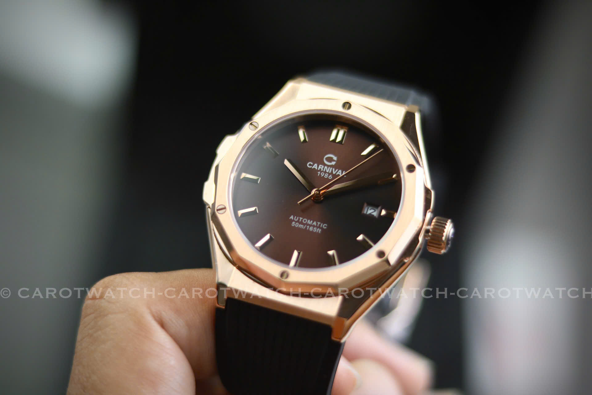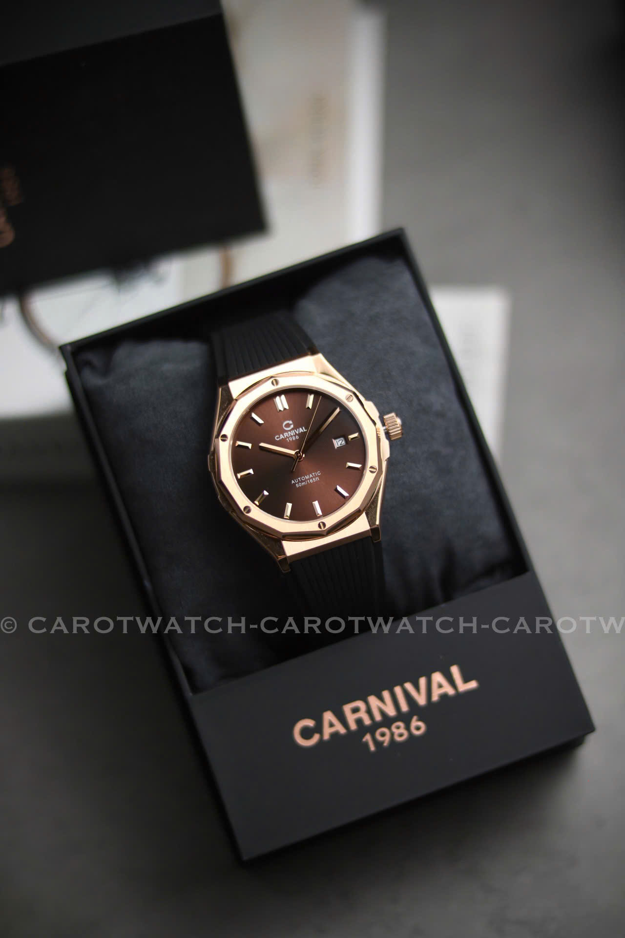 Trong phân khúc đồng hồ cơ tầm trung, ít có mẫu nào vừa mang lại cảm giác khỏe khoắn, thể thao, vừa toát lên vẻ lịch lãm như phiên bản CARNIVAL 8168G-VH-DCS-N. Đây là một biến thể đầy nổi bật thuộc dòng CARNIVAL 8168G, gây ấn tượng với mặt số màu nâu chocolate kết hợp viền vỏ mạ vàng hồng thời thượng – lựa chọn lý tưởng cho những quý ông yêu thích sự khác biệt, sang trọng và cá tính.
