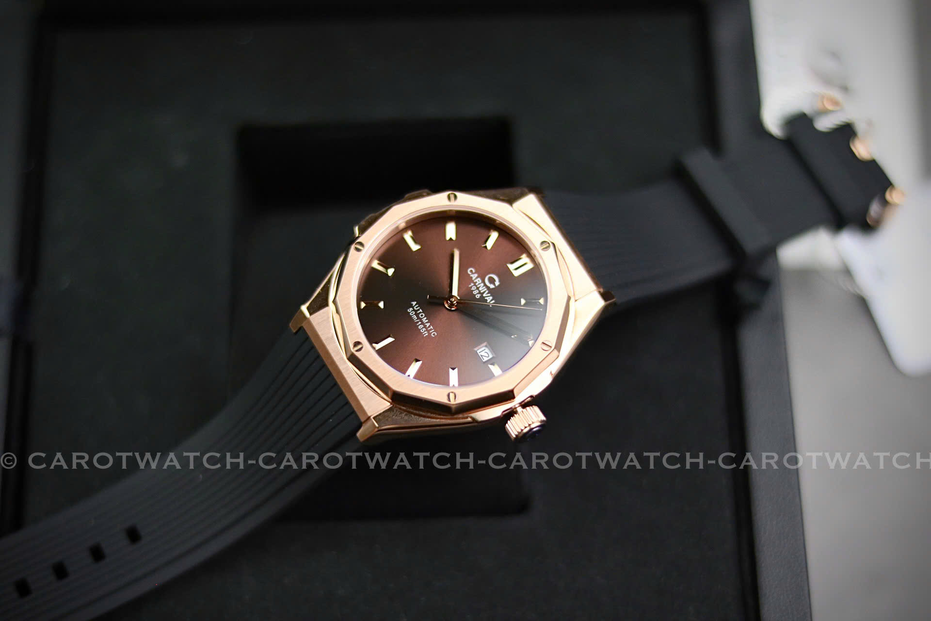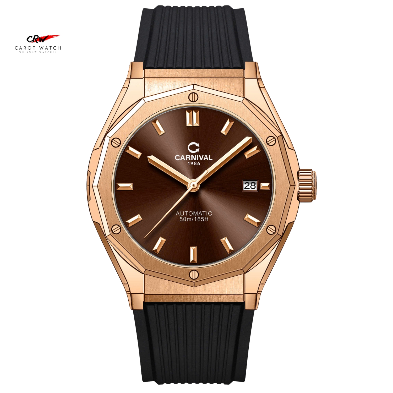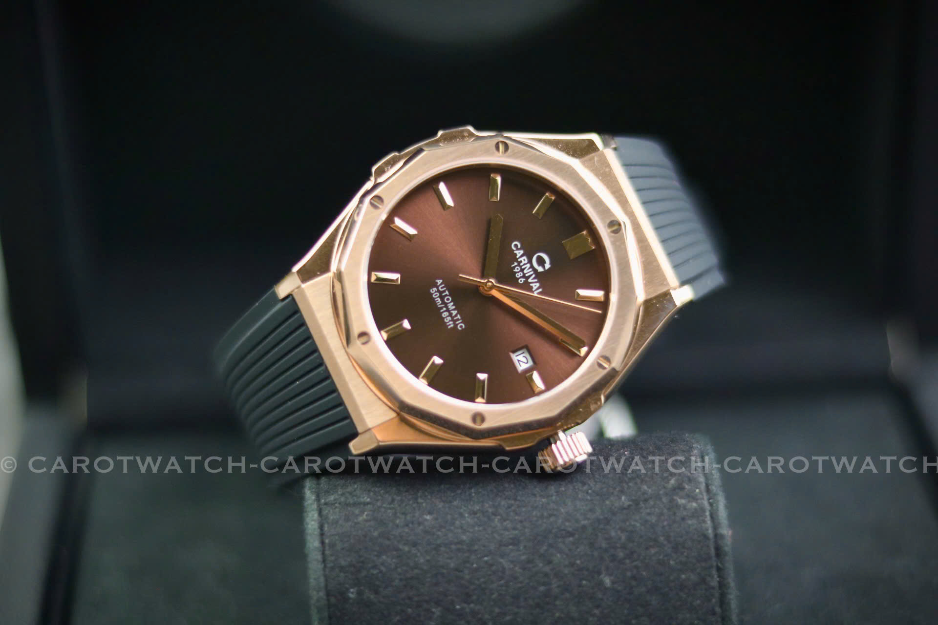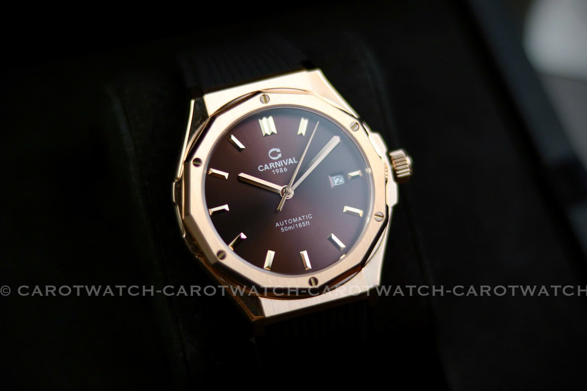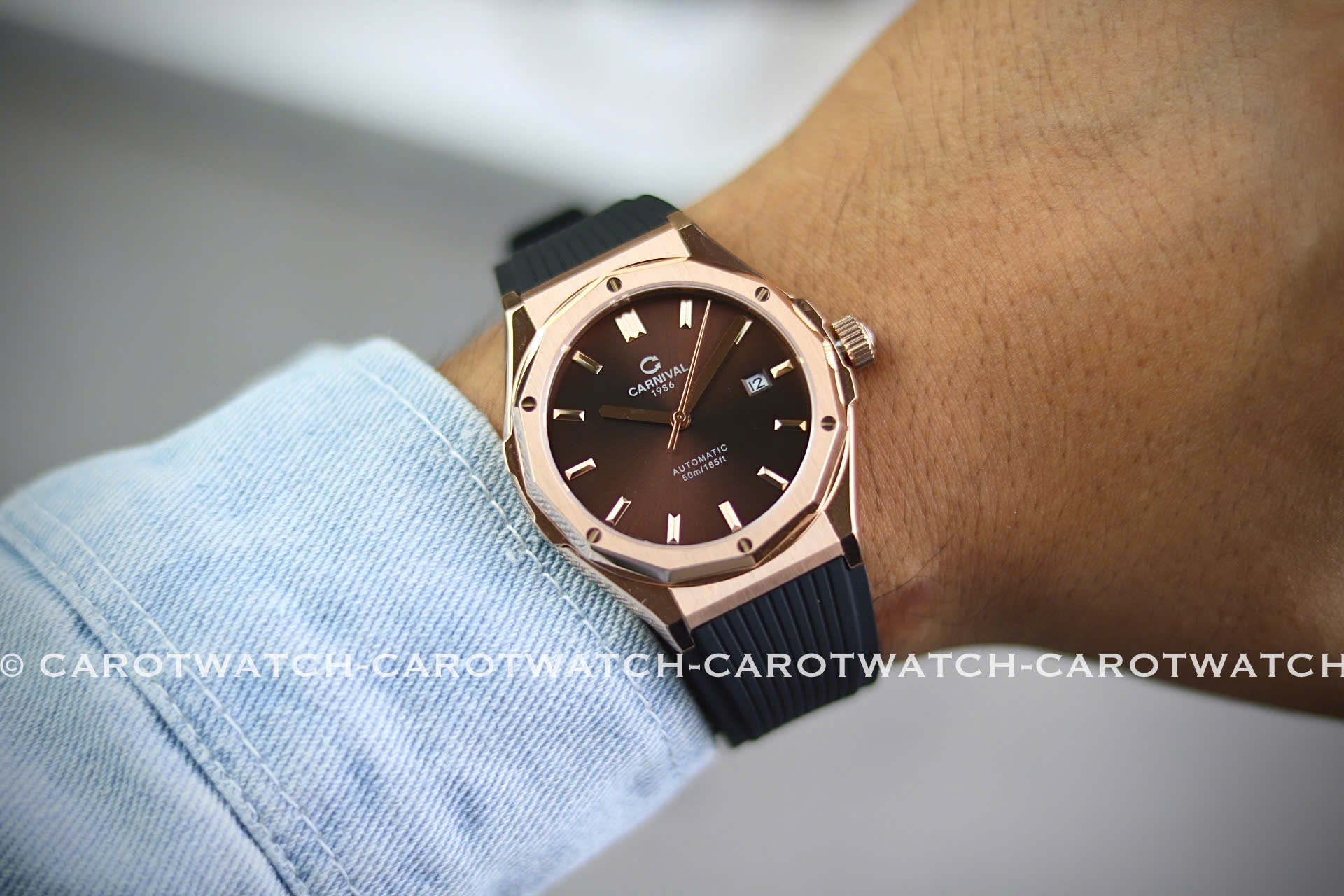 Trong phân khúc đồng hồ cơ tầm trung, ít có mẫu nào vừa mang lại cảm giác khỏe khoắn, thể thao, vừa toát lên vẻ lịch lãm như phiên bản CARNIVAL 8168G-VH-DCS-N. Đây là một biến thể đầy nổi bật thuộc dòng CARNIVAL 8168G, gây ấn tượng với mặt số màu nâu chocolate kết hợp viền vỏ mạ vàng hồng thời thượng – lựa chọn lý tưởng cho những quý ông yêu thích sự khác biệt, sang trọng và cá tính.
