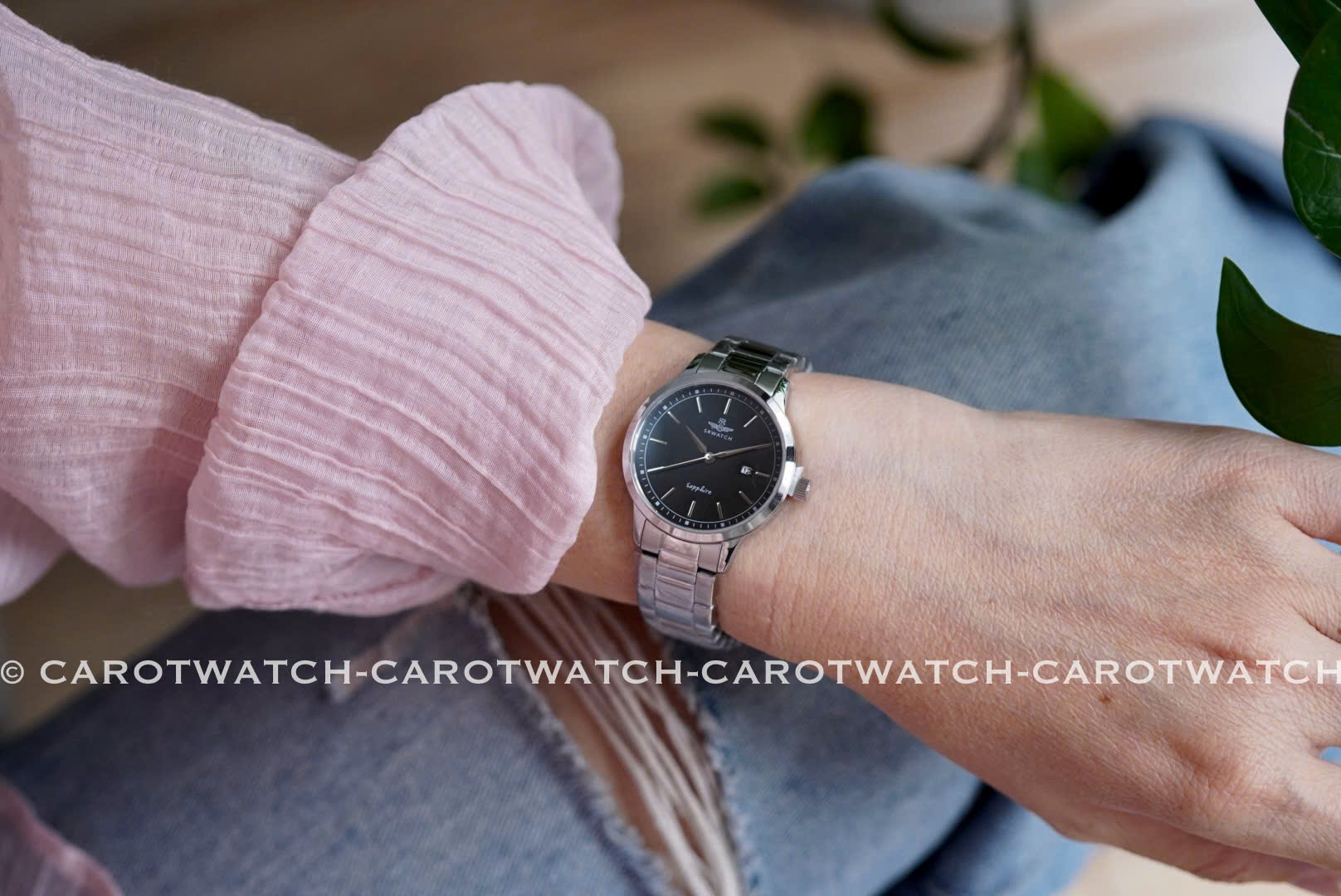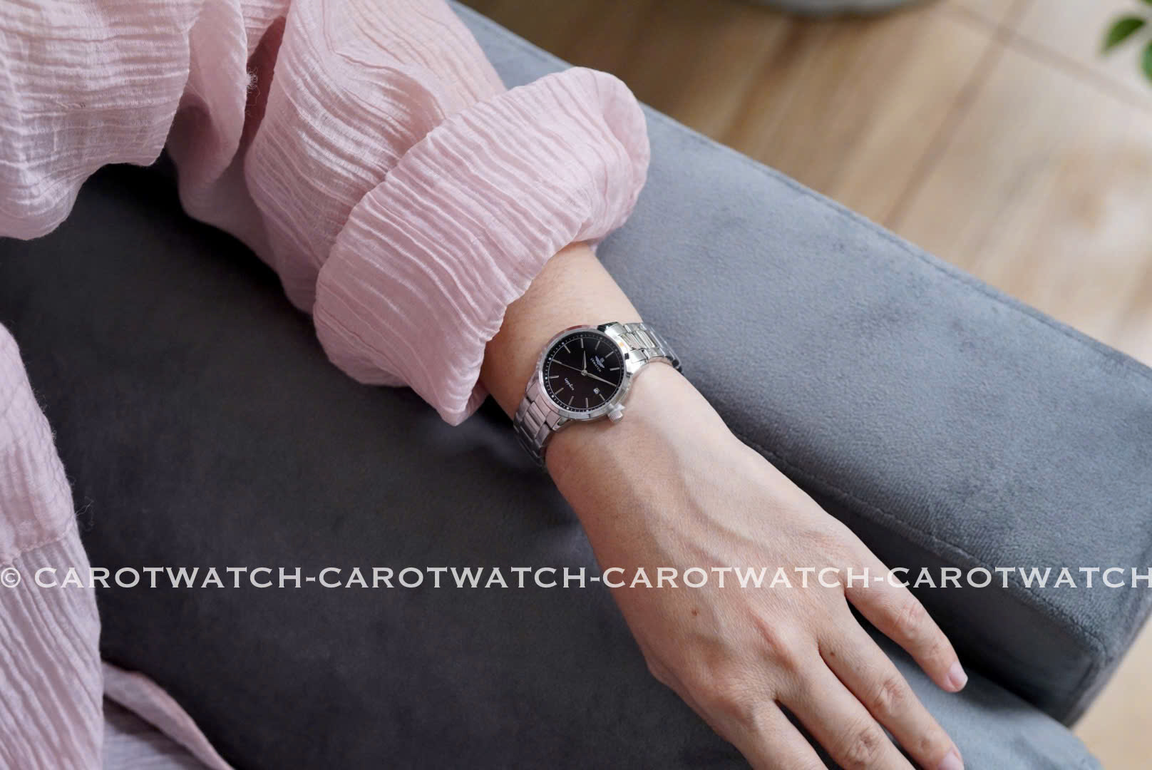 Thiết kế mặt đen kết hợp cùng cọc số kẻ vạch thanh mảnh, sang trọng, dây thép sáng bóng, size 30mm dễ đeo, đi kèm kính sapphire cao cấp và lịch ngày tiện lợi.