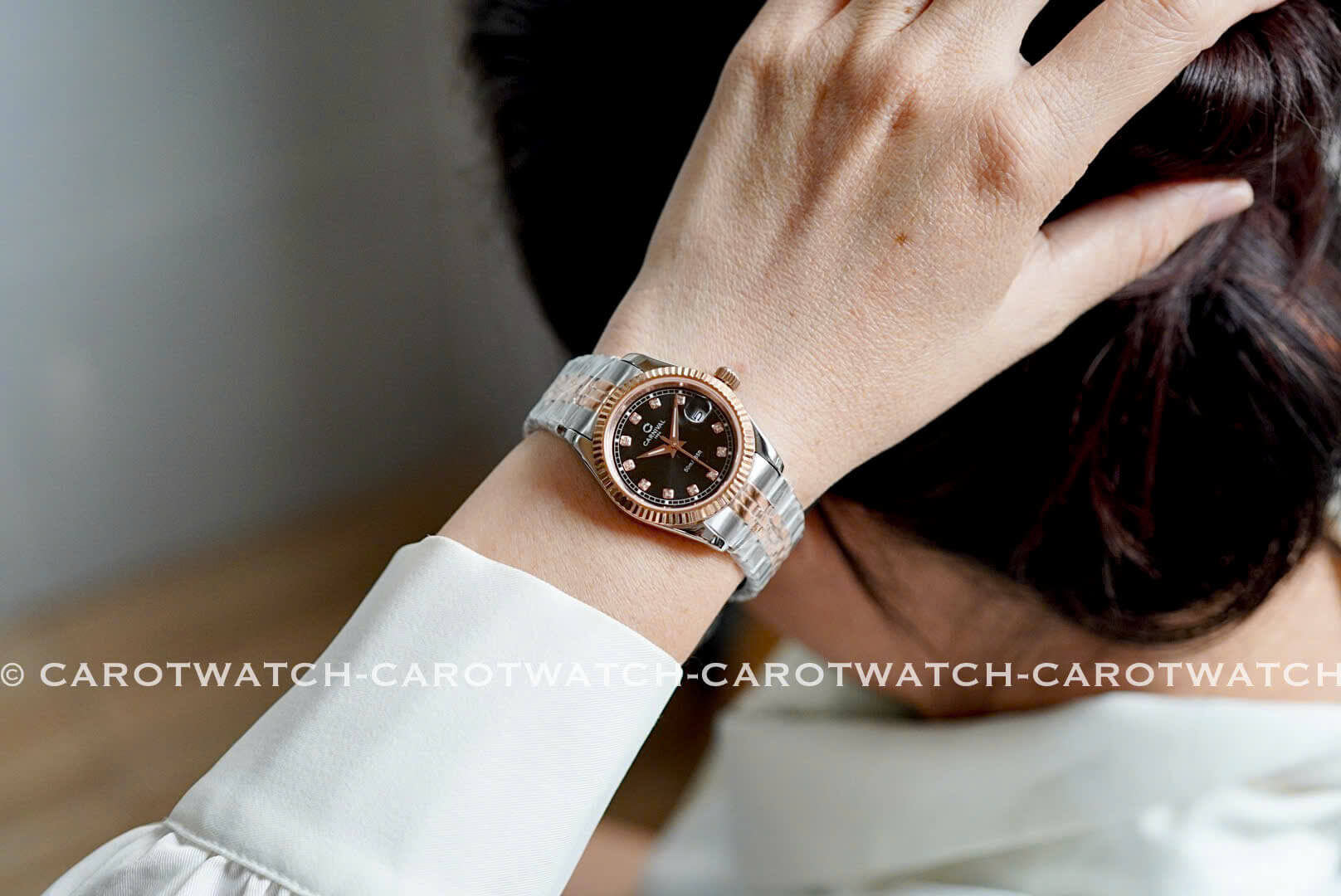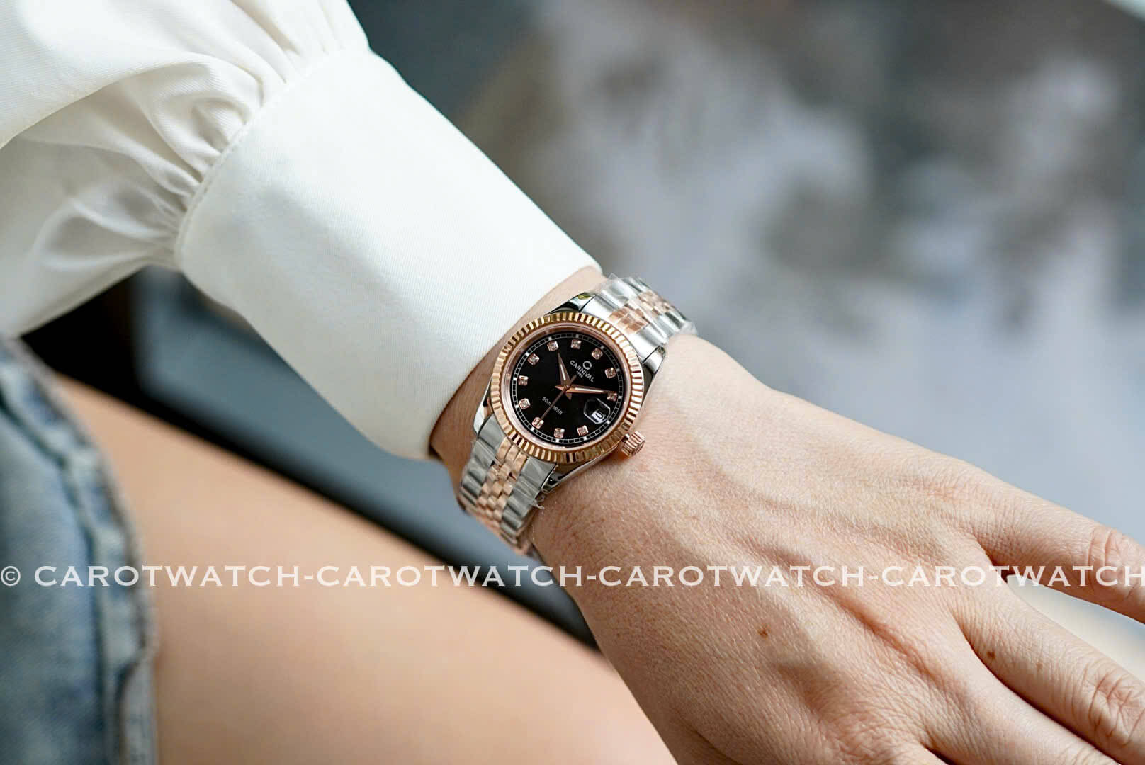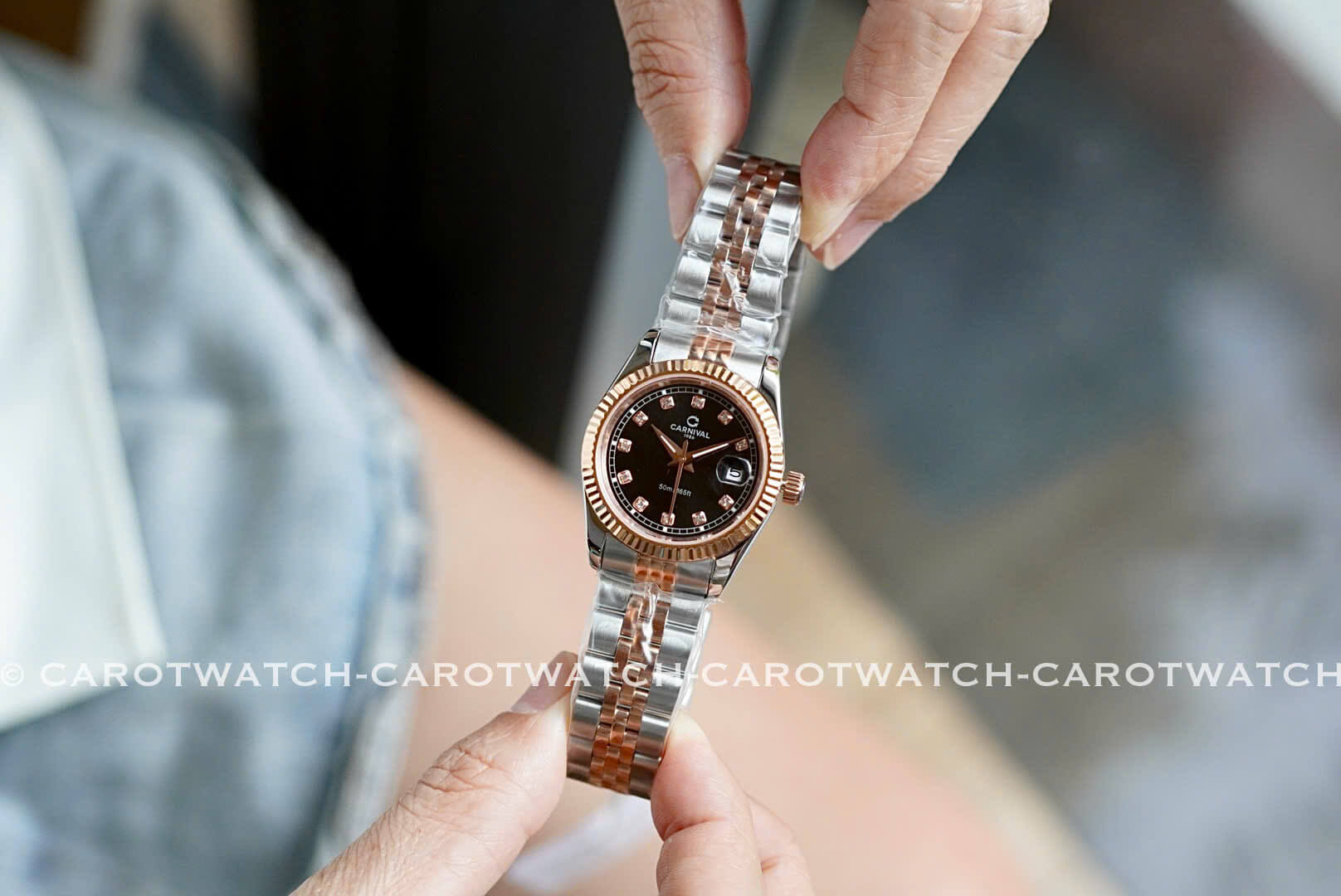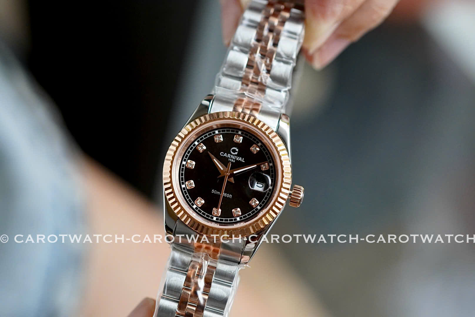 CARNIVAL 8131L-CH-D – Vẫn là dây demi vàng hồng pha trắng, nhưng điểm nhấn ở đây là mặt đen cực kỳ mới lạ và sang trọng. Mẫu đồng hồ dành cho nàng thích sự độc đáo và khác biệt.