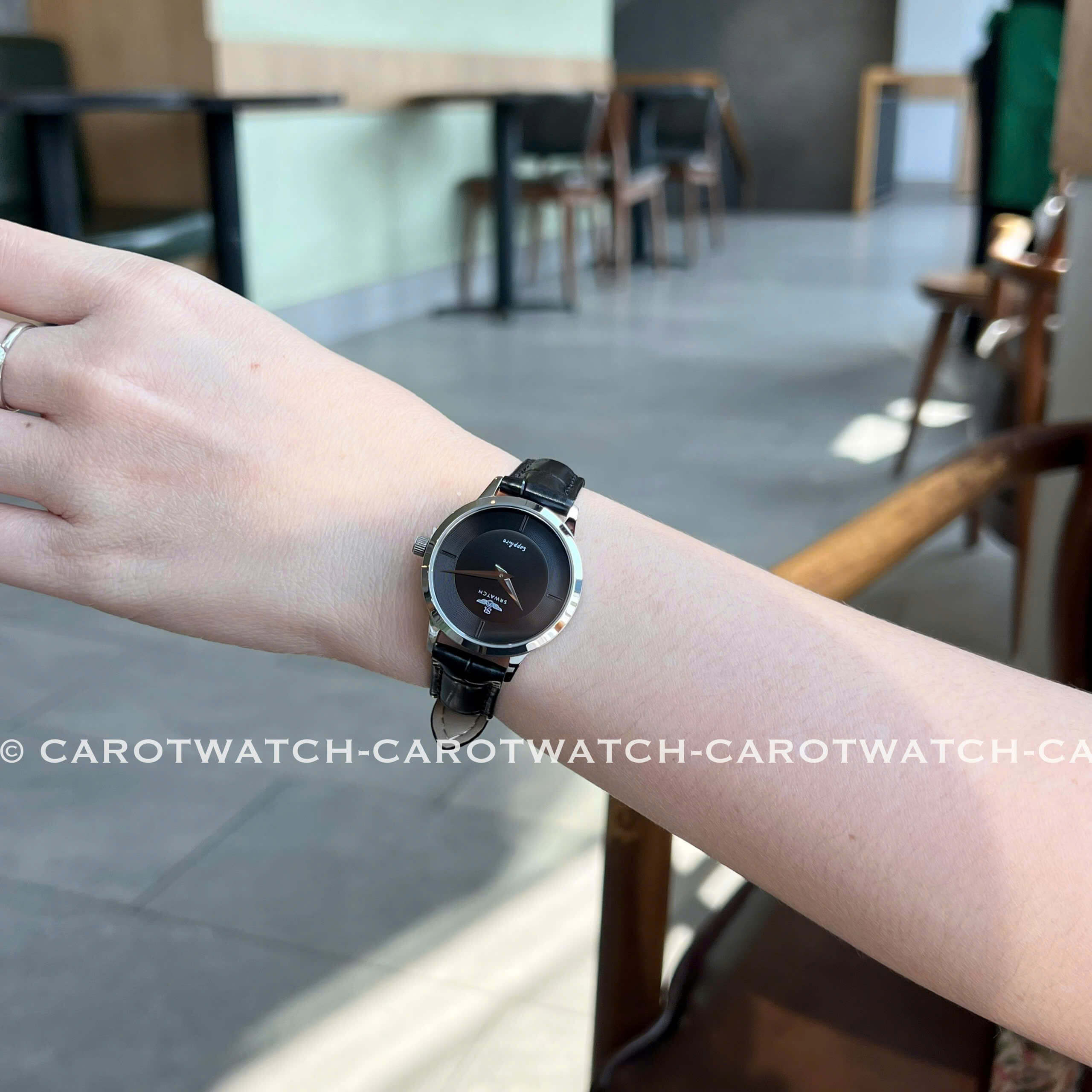 Đồng hồ nữ size 30mm, độ mỏng chỉ 5mm nhẹ nhàng trên cổ tay. Thiết kế tối giản hiện đại, mặt đen – viền thép bạc – dây da đen. Trang bị kính sapphire chống xước, phù hợp cho nàng theo đuổi phong cách tinh tế mỗi ngày.
