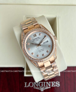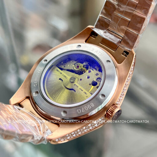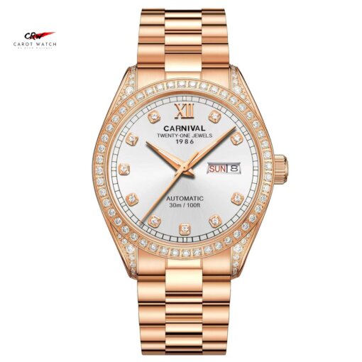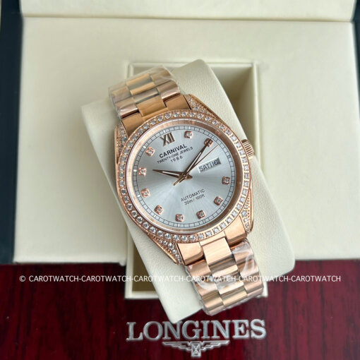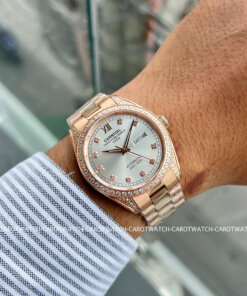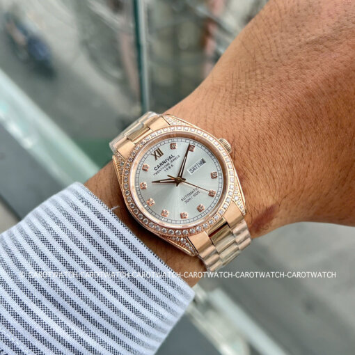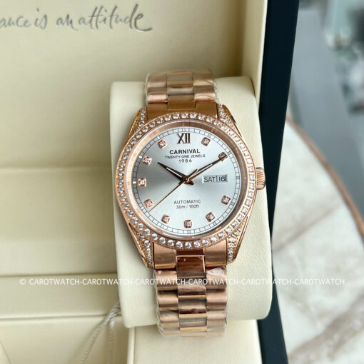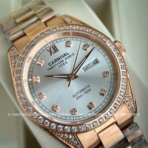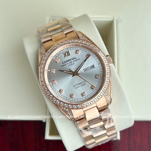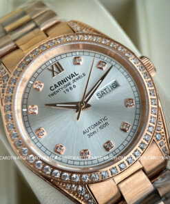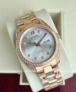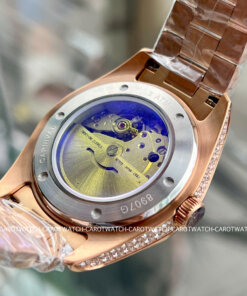 Toàn thân mạ vàng hồng PVD phối cùng mặt trắng đính đá và khung viền đính đá nổi bật. Dây kiểu President bản lớn, chốt gập chắc chắn, kết hợp tính năng lịch thứ – ngày tiện lợi. Một trong những mẫu đồng hồ cơ không chỉ đẹp mà còn rất “ăn ảnh” trên tay nam giới yêu thích sự thời thượng.